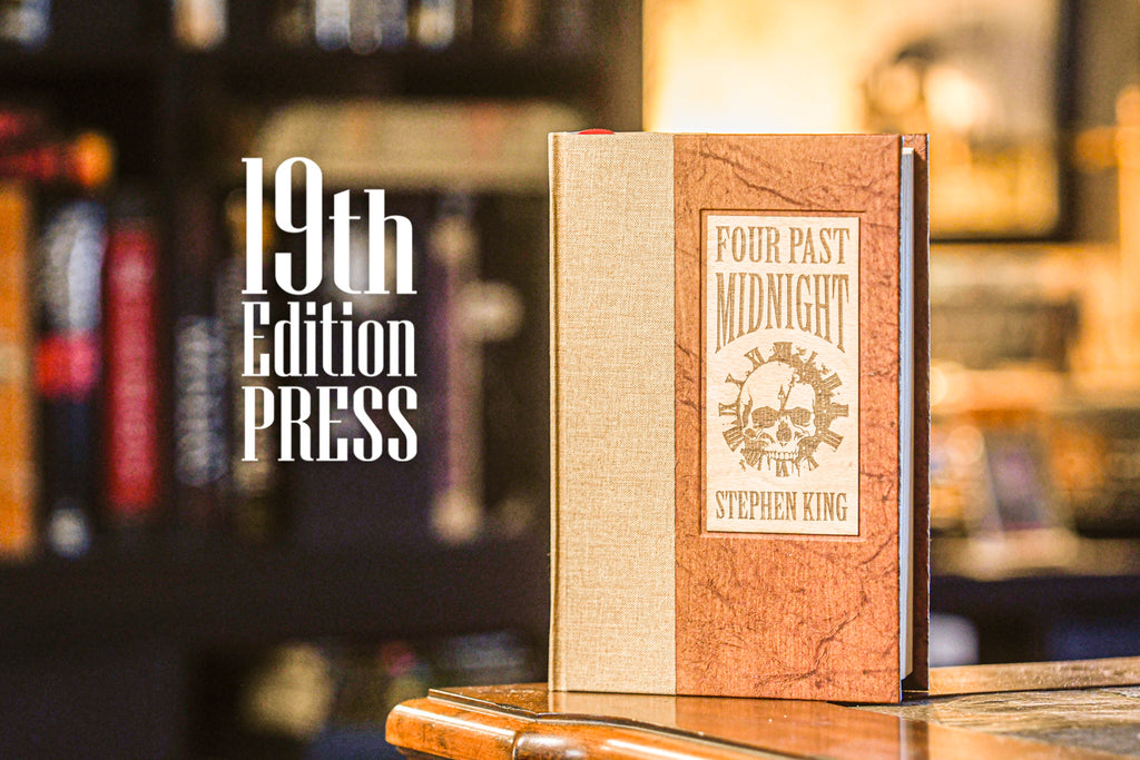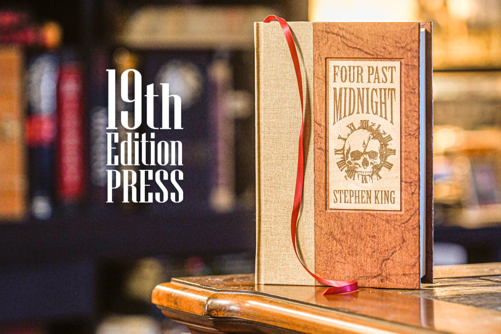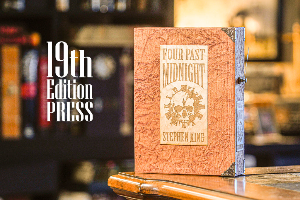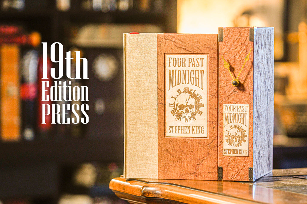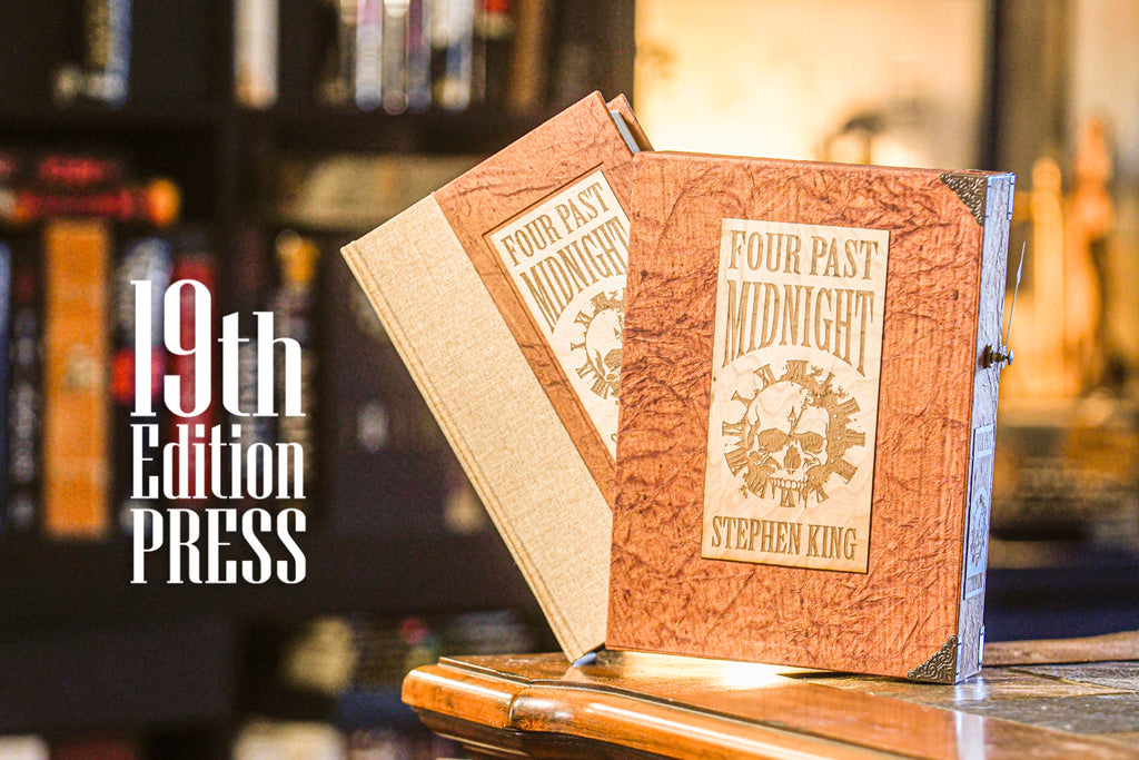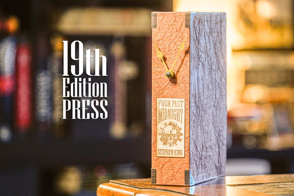 Here is your chance to win a custom rebind of Stephen King's Four Past Midnight housed in a custom slipcase featuring a working analog clock! The rebind features new end papers, new head and tail bands, an integrated bookmark ribbon, a signed limitation page (signed by yours truly!) and an original remarque page . . . both the rebind and the case feature custom engraved graphics on real wood veneer!