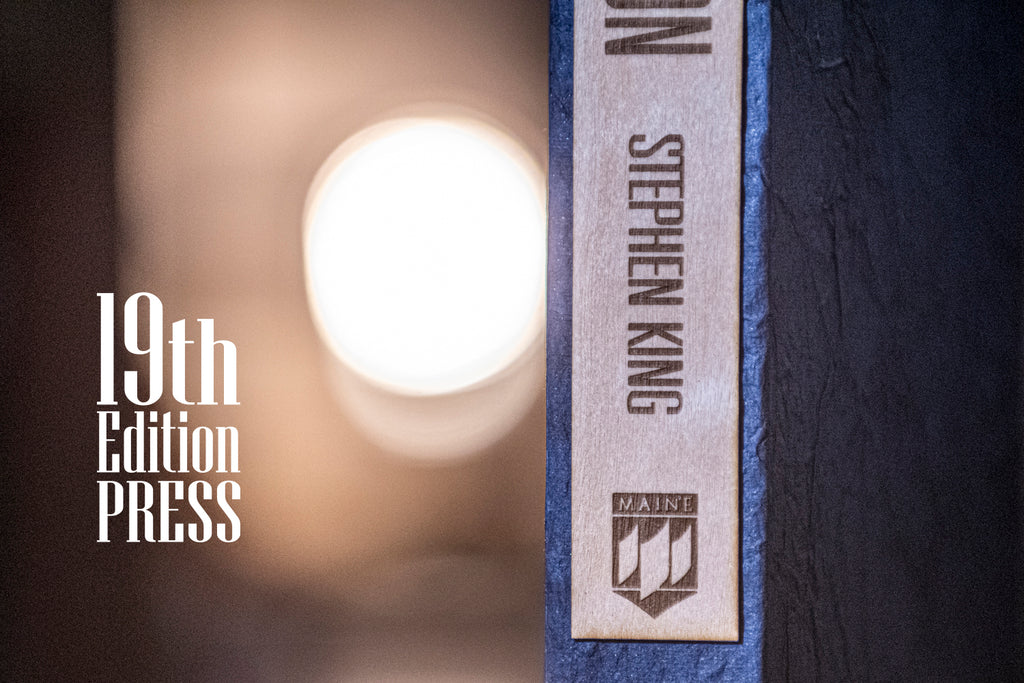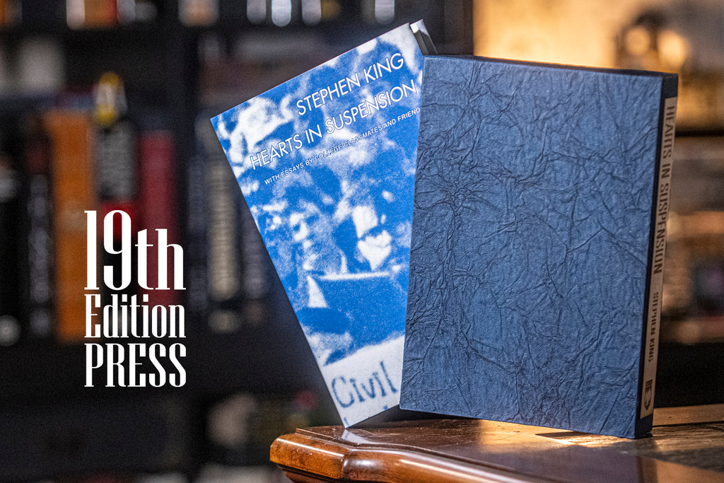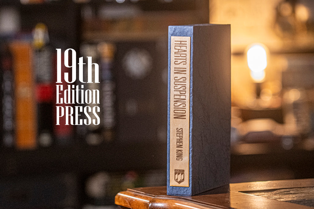 19th Edition is very proud to offer a custom slipcase for Stephen King's Hearts in Suspension from the University of Maine Press . . . each case is handmade and features a custom engraved veneer spine piece affixed to the case. The inside spine piece will be signed by casemaker, Paul Michael Kane!